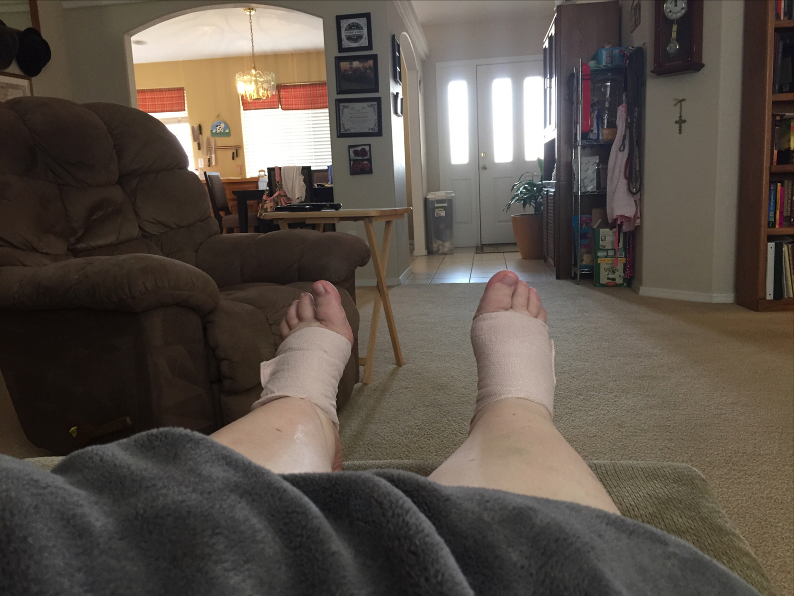 - Take care of your feet! I had wrapped my feet in such a way for flat walking, not anticipating the off-road sand trails (where I tend to walk more on the sides of my feet). I busted my feet up royally–enough to warrant a visit to the doctor this afternoon because I’m concerned how torn up they are. This was my poor feet yesterday, all bandaged to keep the wounds clean and dry until I get them checked out. Thankfully, my feet aren’t in pain.