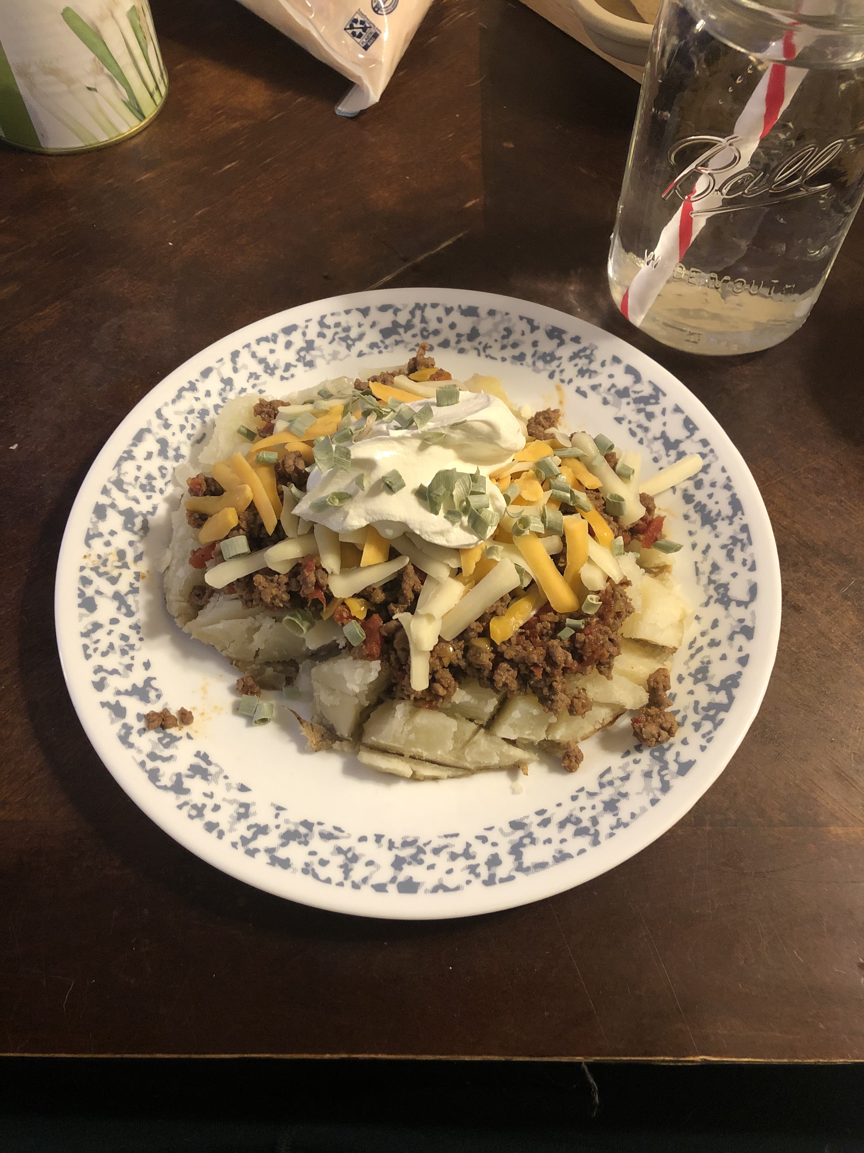 - Once baked potatoes are done, serve up the potato as a base and top with taco meat/meatless option, cheese, sour cream, green onions, and/or whatever your heart desires!